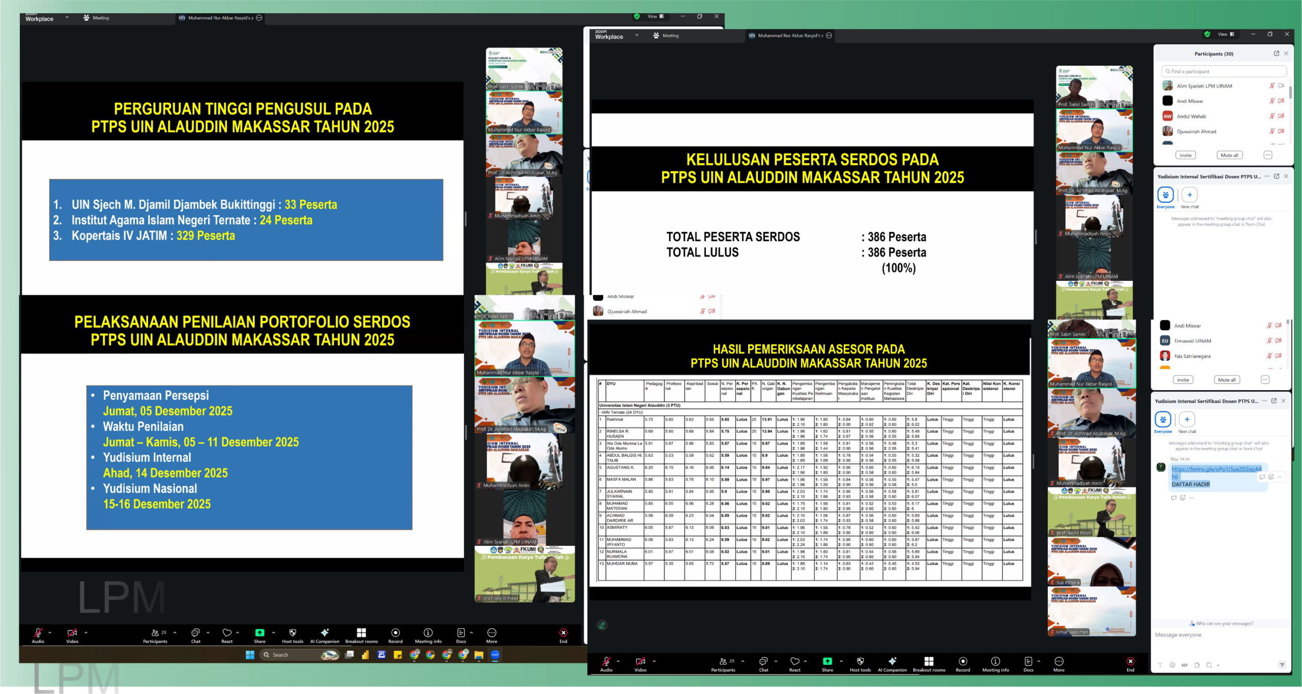 Gowa, 14 Desember 2025 — Lembaga Penjaminan Mutu (LPM) UIN Alauddin Makassar melaksanakan Yudisium Internal Sertifikasi Dosen (Serdos) Tahun 2025 sebagai tahapan akhir setelah selesainya pemeriksaan dan penilaian portofolio dosen peserta Sertifikasi Dosen oleh Perguruan Tinggi Penyelenggara Sertifikasi Dosen (PTPS) UIN Alauddin Makassar.